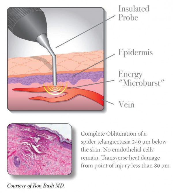 Using an ultra-fine insulated needle, VeinGogh delivers precisely controlled energy just beneath the skin's surface without piercing the vessel itself. The treatment causes these tiny veins to collapse and disappear quickly. Most procedures take less than 20 minutes to perform, with no bandages required following treatment.